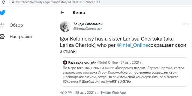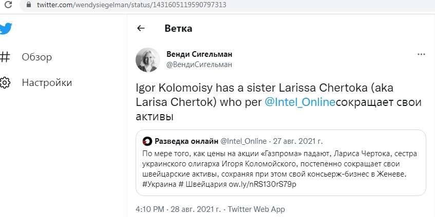 Заодно сотрудники FIS выяснили, что у Игоря Коломойского были «тесные связи с российско-украинской организованной преступностью», а у Ларисы Черток был «доступ к нелегальным средствам и преступным кругам». Помимо этого, по данным FIS, Черток «помогала Коломойскому деньгами неизвестного происхождения», когда его активы заморозили. «Между деятельностью Коломойского и деятельностью его сестры нет никакой границы», - установила FIS, цитируемая в решении суда.