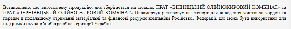 Служба безопасности Украины уличила корпорацию по производству подсолнечного масла Vioil в сотрудничестве со страной-агрессором.