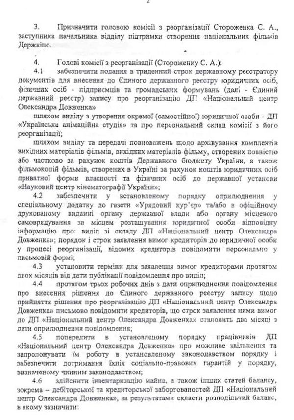 Согласно приказу Госкино, все фильмы из коллекции и имущество Довженко-Центра должны быть переданы Государственному учреждению "Научный центр кинематографии Украины", основным видом деятельности которого по данным ЕГРПОУ является "высшее образование". Из структуры Центра должно быть выделено Государственное предприятие "Украинская анимационная студия", которой будут переданы авторские права на украинскую анимацию, которые сейчас принадлежат Центру. Сотрудники Центра должны быть уведомлены о возможном увольнении.
