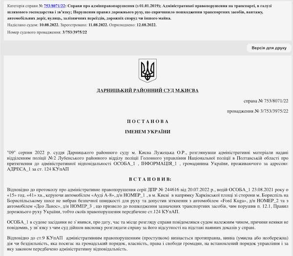 Судья признала Виктора Склему виновным в нарушении правил дорожного движения, что повлекло повреждение транспортных средств или другого имущества (ст. 124 КУоАП). В качестве административного взыскания ему назначили штраф в размере 850 грн.