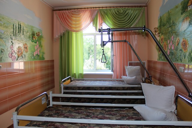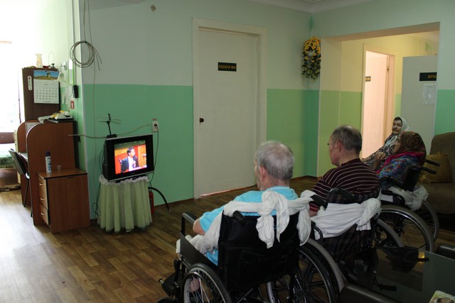 Поднимаемся в отделение: аккуратные комнаты, старички-одуванчики на кроватях и инвалидных колясках. Некоторые из них – с перекошенным от инсультов лицом. Много лежачих. Кто бодрее – сидят в коридоре у телевизора. Заглядываем в каждую палату подряд. Везде чисто, без неприятных запахов, хотя много пациентов в подгузниках. В половине отделения – ремонт, в другой – не так красиво, но аккуратно.