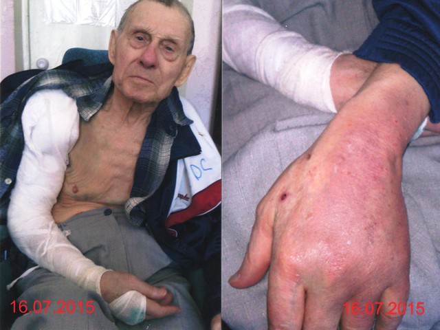 Перевод был назначен на 15.07.15. Из хосписа в Халявин перевозили транспортом горбольницы с сопровождающим. Когда жена пришла в день перевода, увидела жуткую картину: дедушку выкатили на кресле-каталке, а за несколько дней до этого он еще ходил. Лицо дедушки было изможденное, тело - в страшных синяках. Считаю, что так удариться нельзя. Я не медик, но понимаю, что просто так не возникают такие травмы. Здесь надо или ногами бить, или лежащего бить. Рука сломана в двух местах, опухшая и синяя. Это же следы пыток. На ноге нет кожи до кости. Я могу еще понять, что человек упал – и сломал руку. Но как оправдать остальное: раны, отеки, водянки?