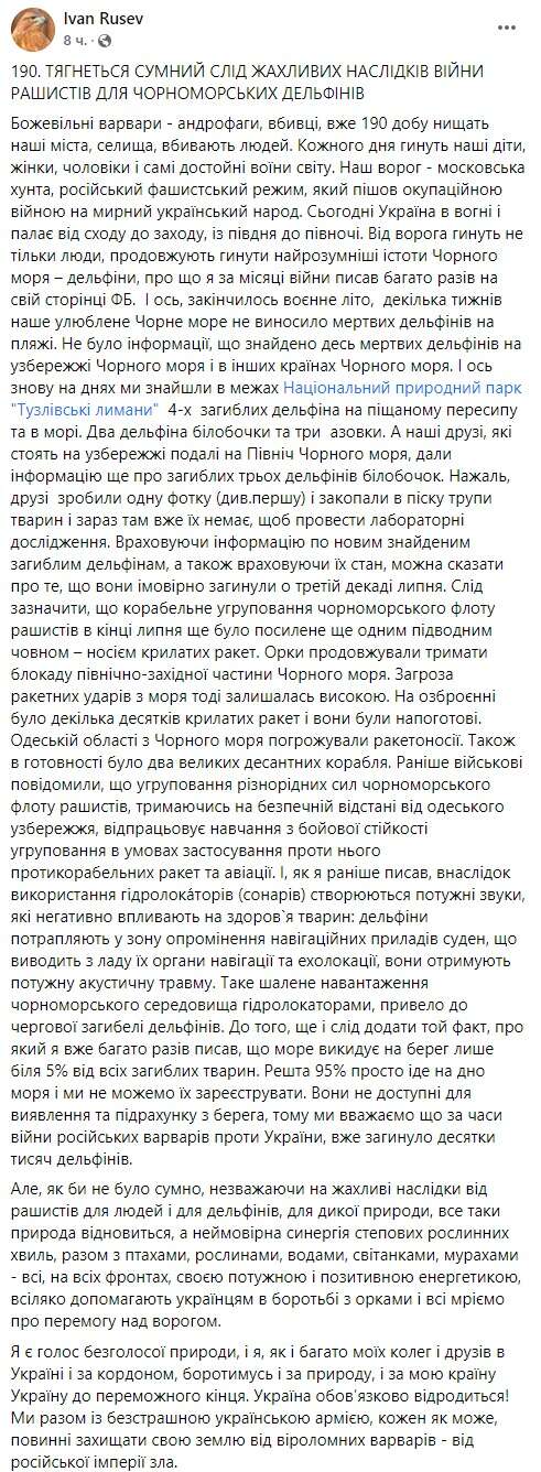 "Такая бешеная нагрузка Черноморской среды гидролокаторами привела к очередной гибели дельфинов. К этому еще следует добавить тот факт, что море выбрасывает на берег лишь около 5% от всех погибших животных. Остальные 95% просто идут на дно моря, и мы не можем их зарегистрировать. Они недоступны для обнаружения и подсчета с берега, поэтому мы считаем, что за время войны русских варваров против Украины уже погибли десятки тысяч дельфинов", - считает ученый.