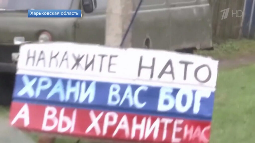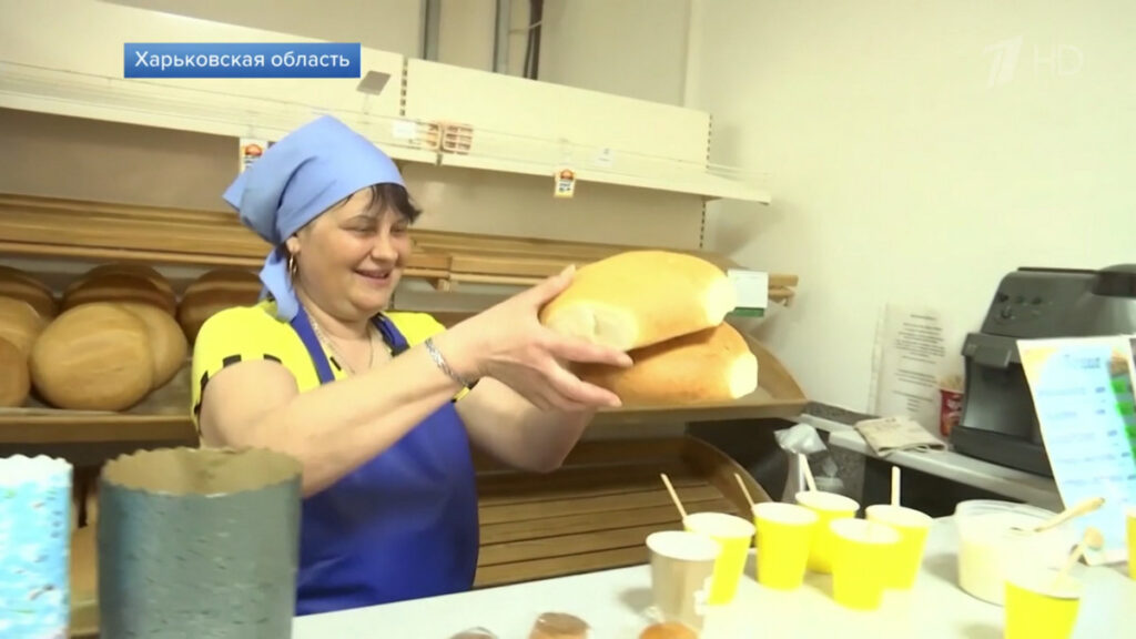 Кадры из российского сюжета о раздаче гуманитарной помощи в Балаклее