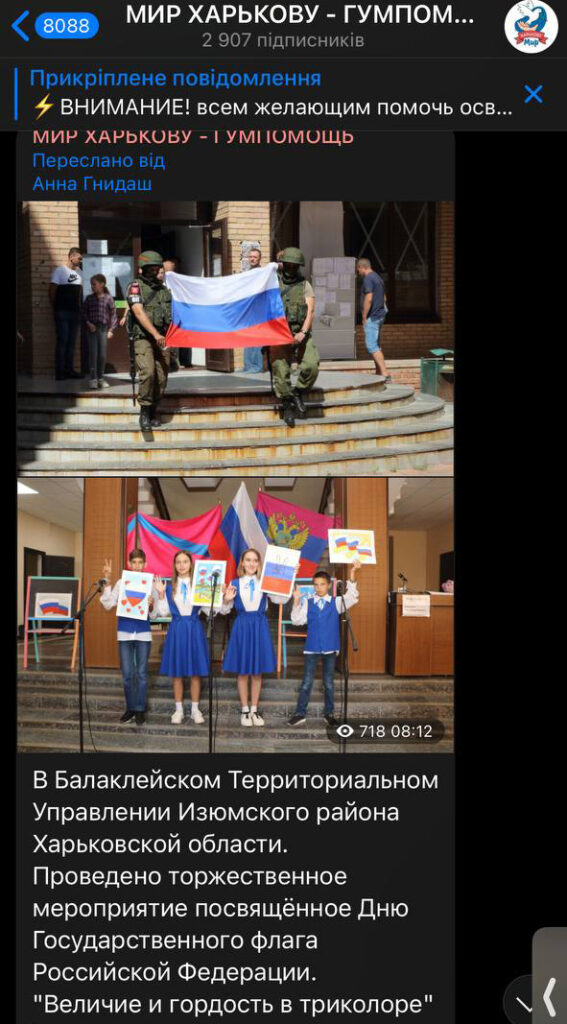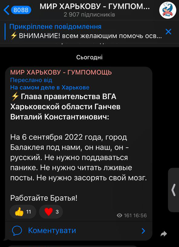 «Господин президент, господин главнокомандующий, город Балаклея Харьковской области взят под контроль. Приказ исполнен. Российские оккупационные войска отошли. Спецподразделение Главного управления разведки «Кракен». Сегодня 8 сентября, 16:00», – говорит украинский военный. На видео видно, что украинские военные стоят на крыше на российском флаге, а сзади развевается украинский флаг.