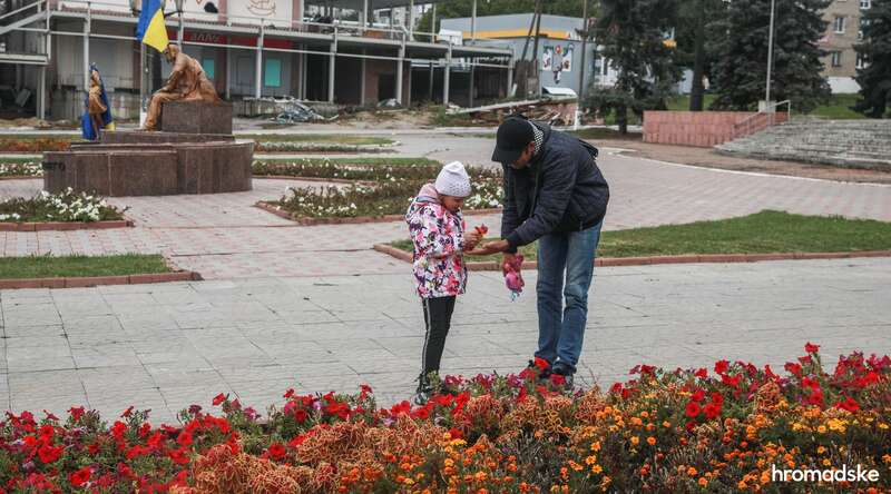 В центре Балаклеи на очень красивом небольшом памятнике Тарасу Григорьевичу Шевченко висит целых два украинских флага. Рядом отдельно гуляют мужчина и женщина со своими детьми. Мальчик поднимается к монументу и осторожно прикасается к флагу. Девочка подходит с папой к клумбе с уцелевшими цветами рядом, они гладят их, отрывают несколько лепестков и бегут куда-то один за другим.