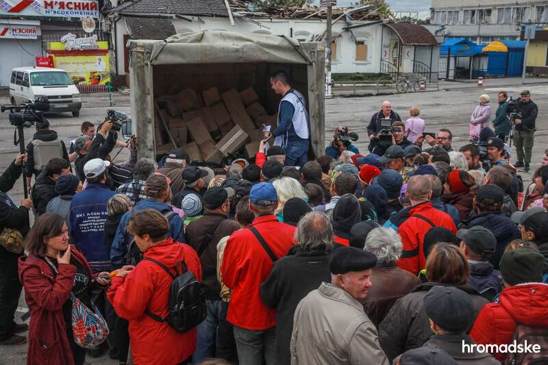 В центре города снова встречаем большую группу людей, ожидающих гуманитарной помощи. Им сообщили еще утром о случившемся, попросив записаться в очередь. В общей сложности набралось более 300 жителей. Но когда грузовик с самым необходимым и вкусностями приехал, все забыли о номерках очередности на руках и началась борьба за место у волонтера. Женщинам с детьми пытались выдавать подарки вне очереди, все остальные будто соревновались, у кого более длинные руки и более напористый характер. О таком можно было бы сказать «как из голодного края», если бы люди действительно не были из голодного края.