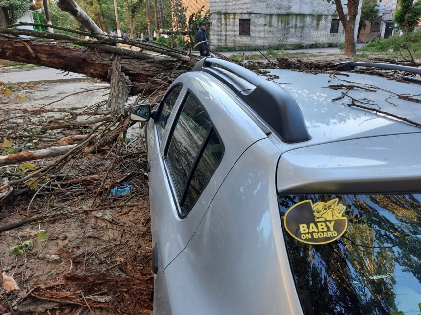 Вслед за мощным ураганом, который пронесся над Сумской областью, непогода пришла и в Николаев. В городе сильный ветер повалил дерево, которое упало на автомобиль.