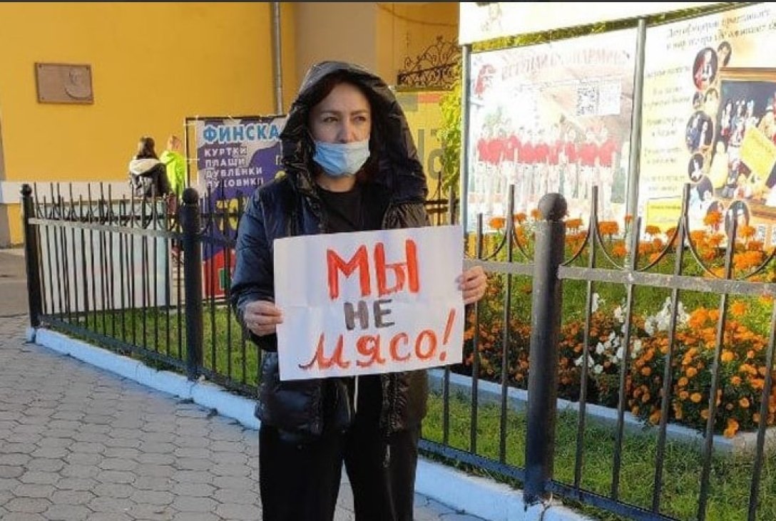 В Чите на одиночном пикете задержана Марина Саломатова, участница движения "Гражданская солидарность Забайкалья". Она стояла с плакатом, на котором написано "Мы не мясо!"