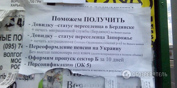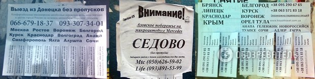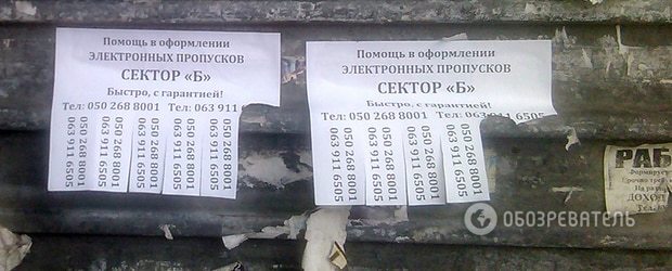До июня самые распространенные объявления касались помощи в получении пропусков для проезда через линию соприкосновения. С введением Службой безопасности Украины электронной системы желающих "помочь" не уменьшилось. Официально сайт Реестра разрешений для перемещения лиц в районе АТО заработал только 7 июля, а вот соответствующие предложения стали активно проявляться на заборах Донецка уже с начала июня.