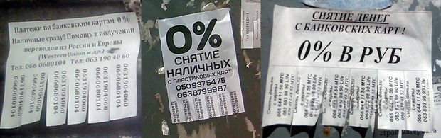 Если еще весной эта услуга шла в среднем под 5%, то в последнее время на объявлениях указано - 0%. Но условие: "обнальщики" у вас снимут (вернее, переведут на свой счет) гривню, а на руки выдадут рубли. В чем прикол? Просто "навар" получается до 20% на разнице курсов и последующей перепродаже столь ценной в "ДНР" гривни.