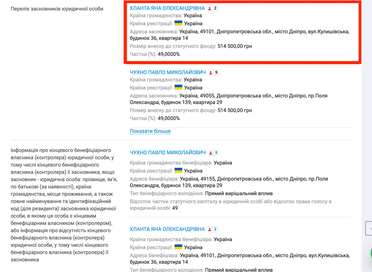 Еще 49% уставного капитала фирмы принадлежат жительнице Днепра Яне Хланте.