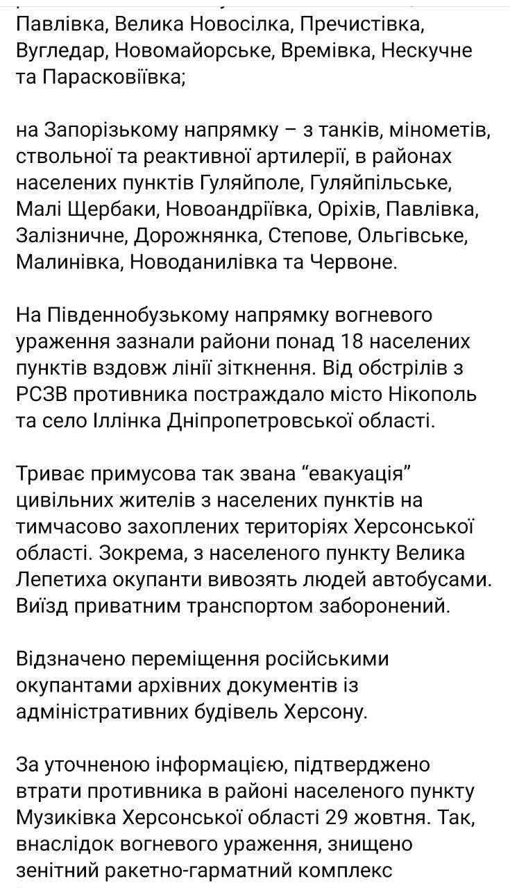 Продолжается эвакуация с захваченной части Херсонской области. В частности, с левого берега, где людей вывозят автобусами из села Большая Лепетиха. Из административных зданий Херсона вывозят архивы и документы.