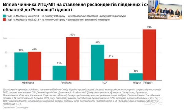 Согласно исследованиям ОО «Детектор Медиа», после того как Путин назвал Революцию достоинства «государственным переворотом» и начал войну на Донбассе, деятели УПЦ МП во время богослужений стали доносить до своей паствы идеи, что в Украине произошел «переворот», добровольцы идут на войну ради наживы, а русский язык в Украине притесняют.