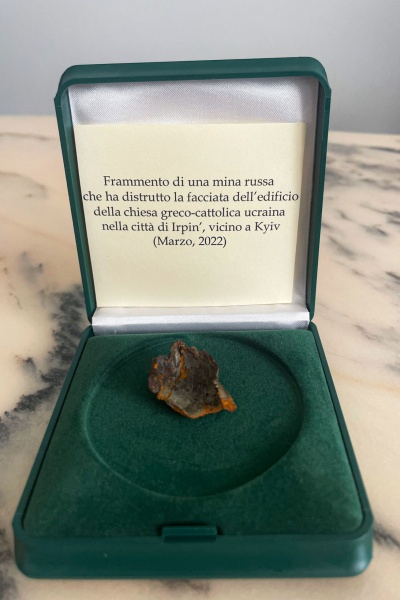 Глава УГКЦ Святослав Шевчук подарил Папе Римскому Франциску фрагмент российской мины, которая в марте уничтожила фасад храма в Киевской области.