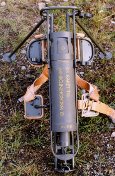 Шведская система разминирования рассчитана на несколько человек. Один несет трос со взрывчаткой, а второй саму пусковую установку.