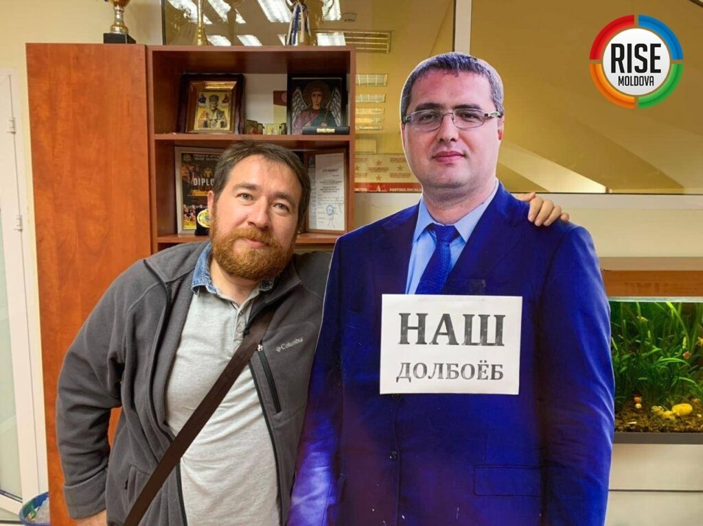 Широбоков в штабе социалистов с картонной фигурой экс-мэра Бельц Ренато Усатого — конкурента социалистов на выборах. Источник: RISE Moldova