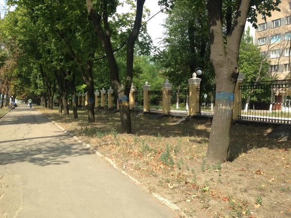 24. У больницы Калинина в Донецке. Говорят украинские флаги замазали дэнээровским траурным триколором, но он облез.