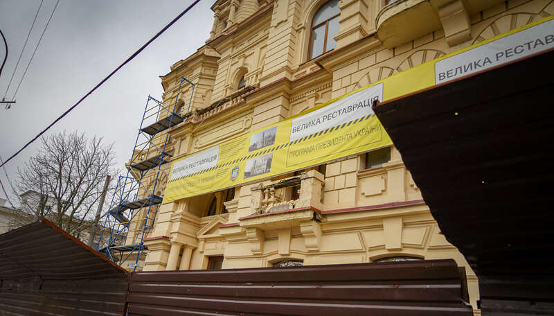Здание Художественного музея привлекает большим баннером «Большая реставрация. Программа президента Украины».