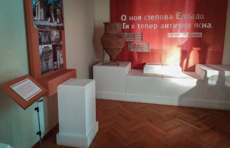 «О, моя степная Эллада, ты и ныне антично-ясна», — написаны строчки Евгения Маланюка на красном полотне над пустыми стендами, где выставлялись еще как минимум четыре амфоры.