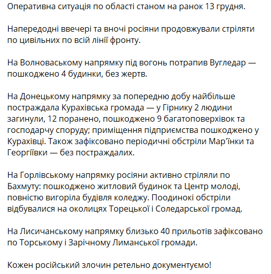 На Горловском направлении россияне активно стреляли по Бахмуту: поврежден жилой дом и Центр молодежи, полностью выгорело здание колледжа. Единичные обстрелы происходили в окрестностях Торецкой и Соледарской громад.