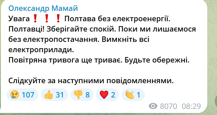 Александр Мамай пишет, что Полтава осталась без электроэнергии и призывает жителей города сохранять спокойствие и выключить все электроприборы.