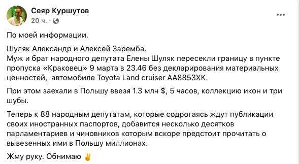 Оба они, несмотря на всеобщую мобилизацию, выехали из страны в начале марта. Об этом в своем Фейсбуке сообщил бизнесмен Сеяр Куршутов, ссылаясь на собственные источники. При этом родственники главной «слуги» прихватили 1,3 миллиона долларов наличными, старинные иконы и три шубы. Каких-либо опровержений, кстати, ни от самой Шуляк, ни от ГПСУ по этому поводу так и не было.