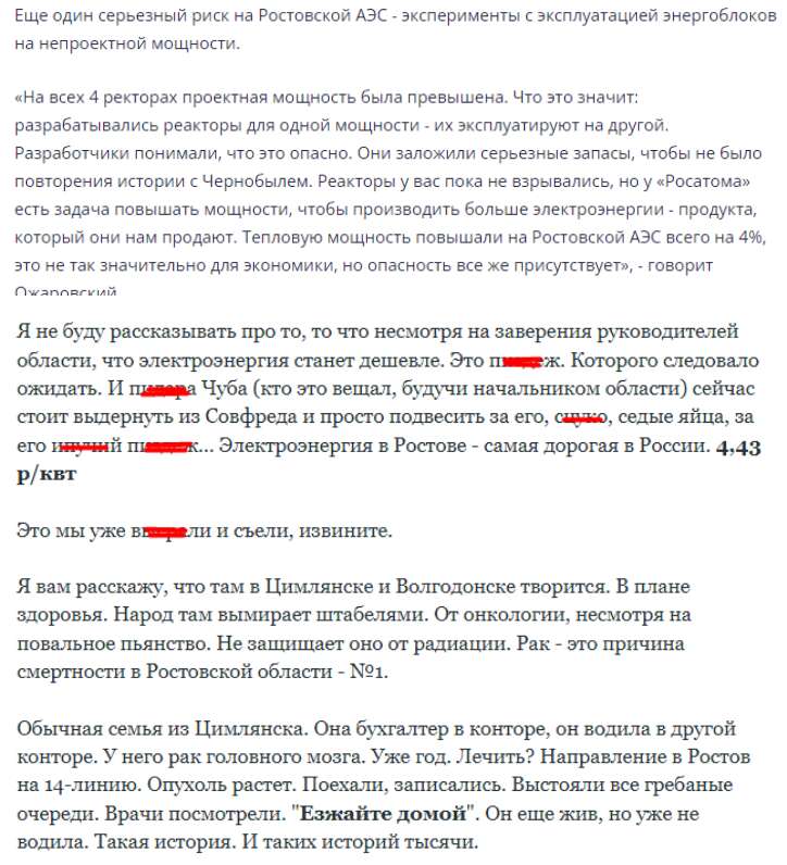 Как я насчитала по мониторингу соцсетей Ростовской области, об авариях или гибели людей на Ростовской АЭС, находящейся в Волгодонске, писали 4 раза за прошлый год. Каждый раз это был пожар, трещина или остановка и гибель одного или нескольких человек, потому что это скрывалось.