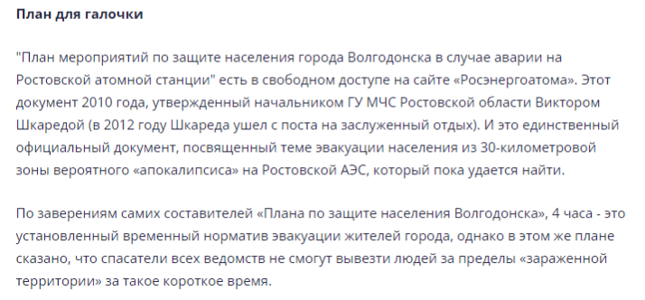 Позволю себе еще одно цитирование выступления председателя городской Общественной палаты Ростовской области Виктора Стадникова, но в переводе, чтобы читателю было понятно: «Жители города Волгодонска в Ростовской области в случае аварии на Ростовской АЭС фактически окажутся в блокаде. Это связано с транспортной доступностью. В случае аварии на атомной станции, мы просто не успеем эвакуировать жителей города. У нас нет поездов — мы остались без железнодорожного вокзала, без порта. Закрыли аэропорт. До сих пор не построен третий мост, обещанный еще несколько лет назад. Единственная автомобильная 25-километровая трасса в сторону Ростова в ужасном состоянии».