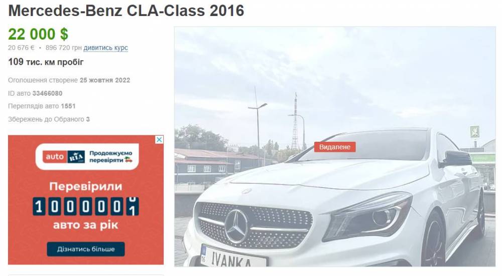 Любопытно, что Плантовская фотографировалась на капоте машины Mercedes-Benz CLA (2016) с номерным знаком IVANKA. Впоследствии именно этот автомобиль пытались продать за 22 тыс. долларов. Спрашивается, откуда у капитана ГПСУ деньги на покупку такого авто?