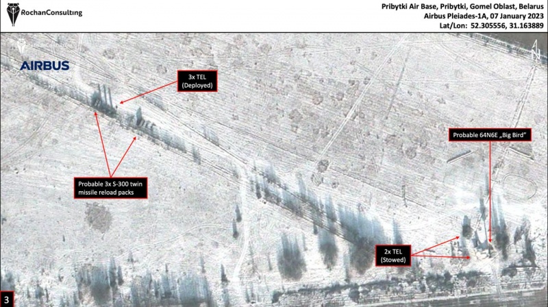 На свежих фото аэродрома "Зябрівка" в Гомельской области можно увидеть дивизион из 9 единиц зенитно-ракетных комплексов С-300/400, которые находятся там уже длительное время. Кроме того, там размещен ЗРПК "Панцирь", стоящий на насыпи грунта, грузовые машины, а также несколько радаров, которые Rochan Consulting определил как 76N6 и 64N6E.