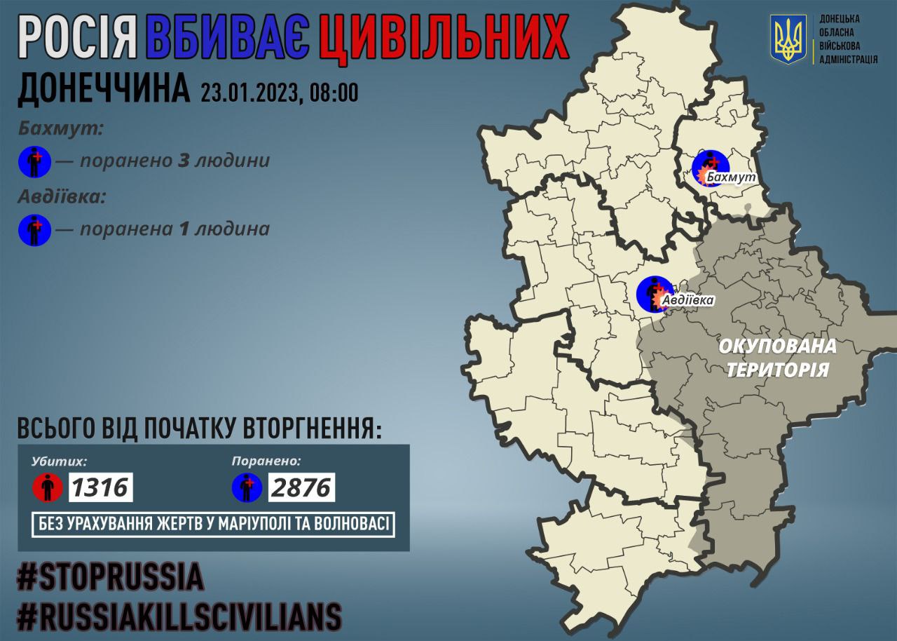 "За 22 января россияне ранили 4 жителя Донбасса: 3 в Бахмуте и 1 в Авдеевке. В настоящее время невозможно установить точное количество жертв в Мариуполе и Волновахе", - написал Кириленко в телеграм-канале в понедельник утром.