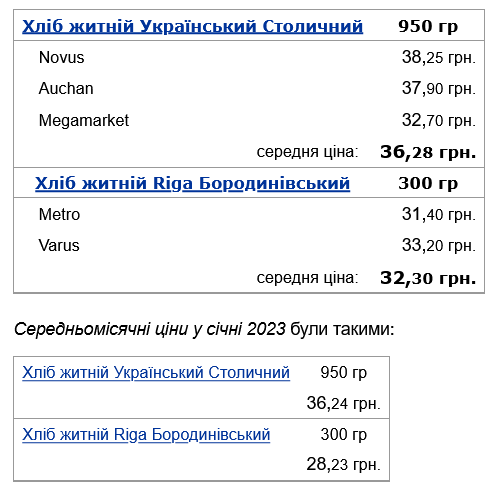 А вот хлеб ржаной Украинский Столичный подорожал почти незаметно – всего на 4 коп. Его цена выросла с 36,24 грн за буханку в 950 г до 36,28 грн. Цены в магазинах: