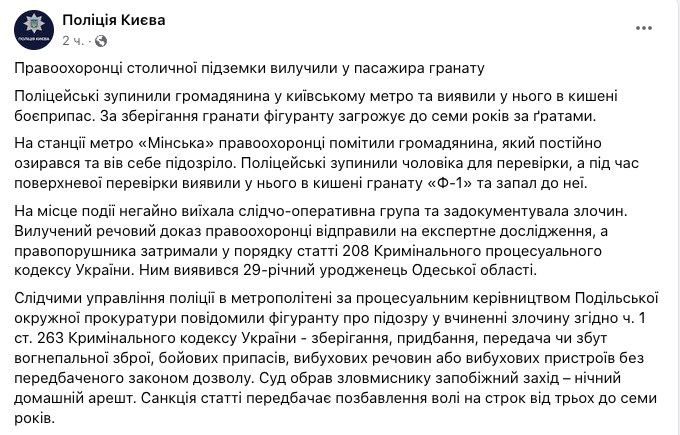 На станции киевского метро "Минская" полицейские изъяли у пассажира гранату Ф-1. Мужчину отправили под ночной домашний арест - то есть в дневное время он сможет и дальше находиться на улице.