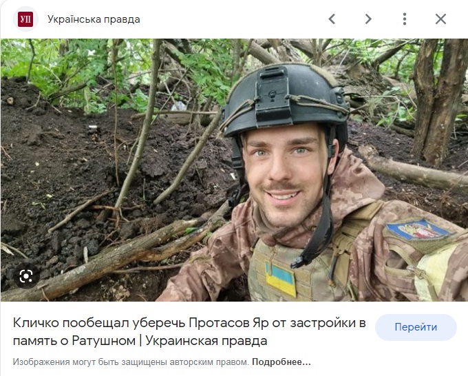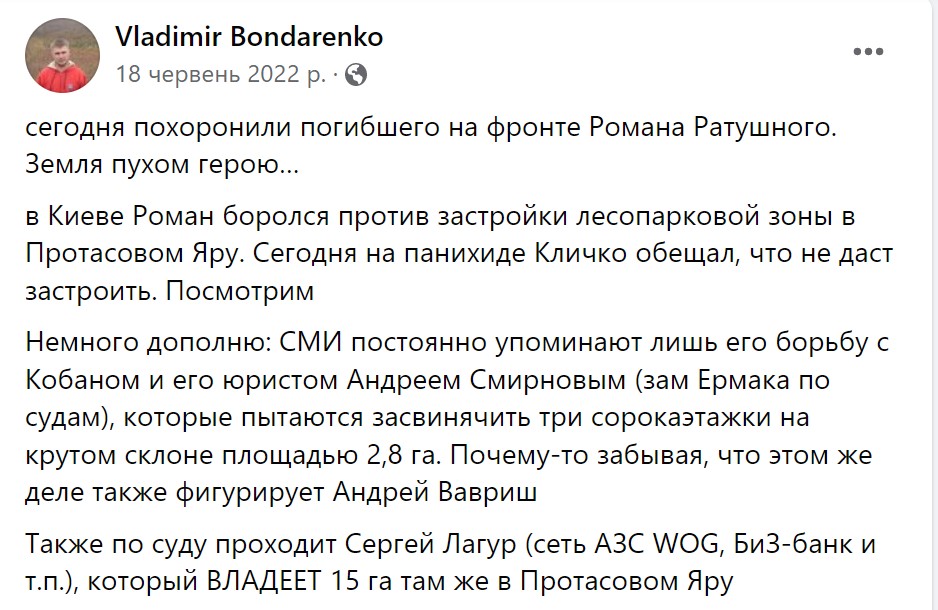 После гибели Ратушного на фронте Кличко публично пообещал сберечь Протасов Яр от застройки.