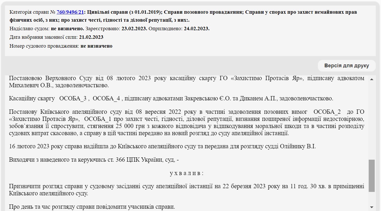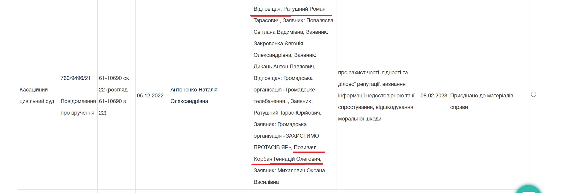 Но все это не помешало Геннадию Корбану и дальше судиться с уже погибшим Романом Ратушным. 5 декабря 2022 года Кассационный гражданский суд назначил дело о рассмотрении иска Геннадия Корбана к Роману Ратушному к рассмотрению на 08 февраля 2023 года: