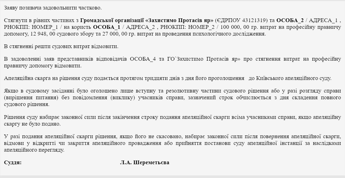 Что же хочет Геннадий Корбан? А хочет он «Стягнути в рівних частинах з Громадської організації «Захистимо Протасів яр» (ЄДРПОУ 43121319) та Ратушного Романа Тарасовича на користь Корбана Геннадія Олеговича 100 000, 00 грн. витрат на професійну правничу допомогу, 12 948, 00 судового збору та 27 000, 00 грн. витрат на проведення психологічного дослідження»: