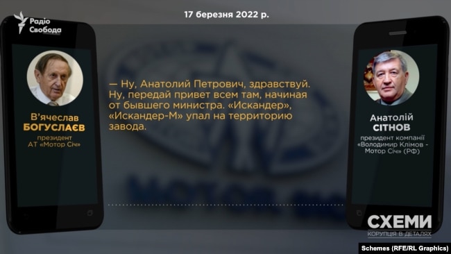 – Вы запускайте это среди Леонова. Скажите всем, что «Мотор Сич» бомбят. Позвони ему, скажи: что вы, бл***, делаете? И пусть на совещании у министра скажет, что Вячеслав Саныч вам привет всем передает. Он познакомился с "Искандером-М", это ракета с шариками.