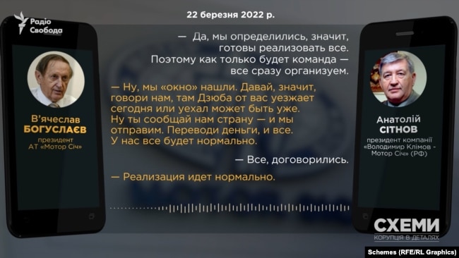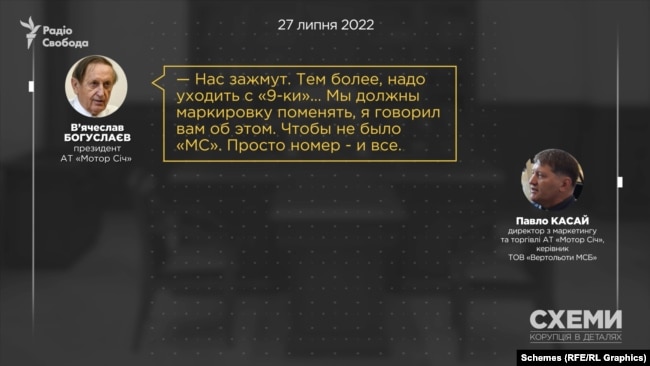 В распоряжении «Схем» есть разговор, также свидетельствующий о другом. В августе 2022 года, на 8-й месяц полномасштабной войны России против Украины, Дзюба и Богуслаев лицом к лицу обсуждают схему поставок двигателей для этой страны – называя их «катушками».