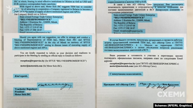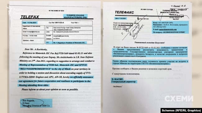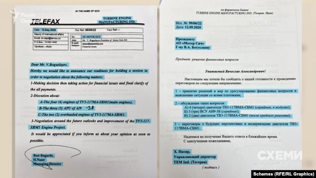 В распоряжении Схем есть документы, свидетельствующие о том, что Мотор Сич также ранее продавал такую модель двигателей - АИ-9 - подсанкционному предприятию Ирана. Это следует из переписки Богуслаева и руководителя иранской компании через два года.