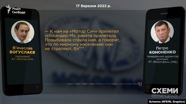 – К нам на «Мотор Сич» прилетел «Искандер-М», ракета прилетела. Повыбивала стекло нам, а говорят, что по мирному населению не стреляют, бл***, – сказал Богуслаев Кононенко.