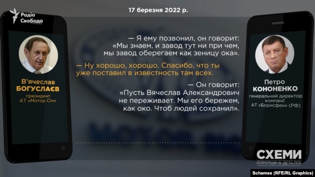 – Официально должность почетного президента «Мотор Сичи» не предусматривает каких-либо административно-хозяйственных функций. Управление предприятия какого-либо официально нет, – сказал журналистам «Схем» адвокат Богуслаева Руслан Волынец.