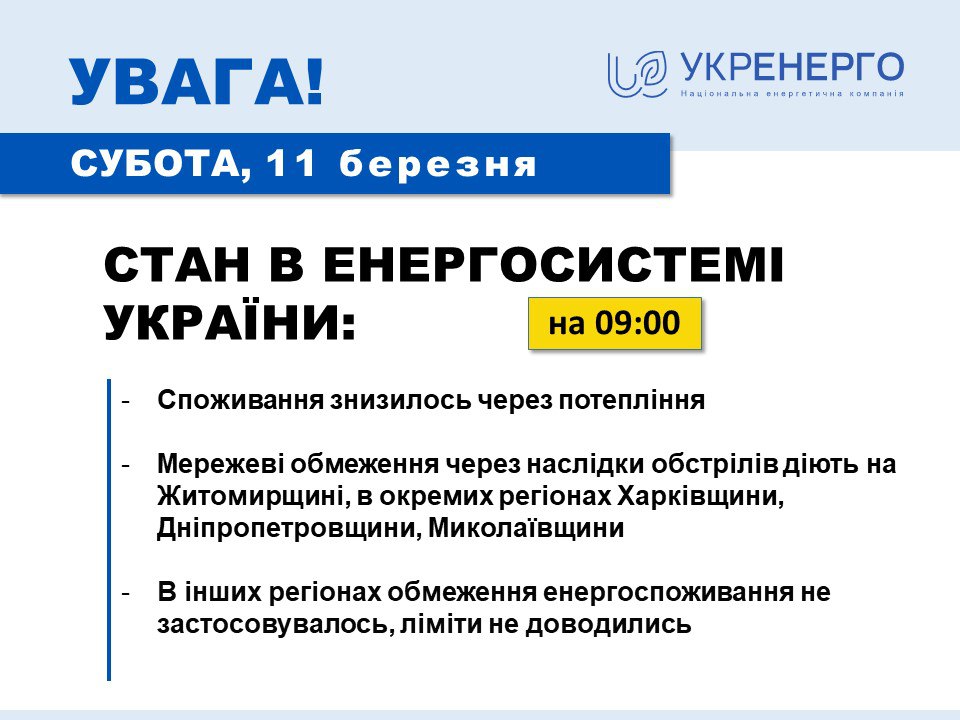 Также есть сетевые ограничения из-за последствий обстрелов в отдельных районах Днепропетровской и Николаевской областей.