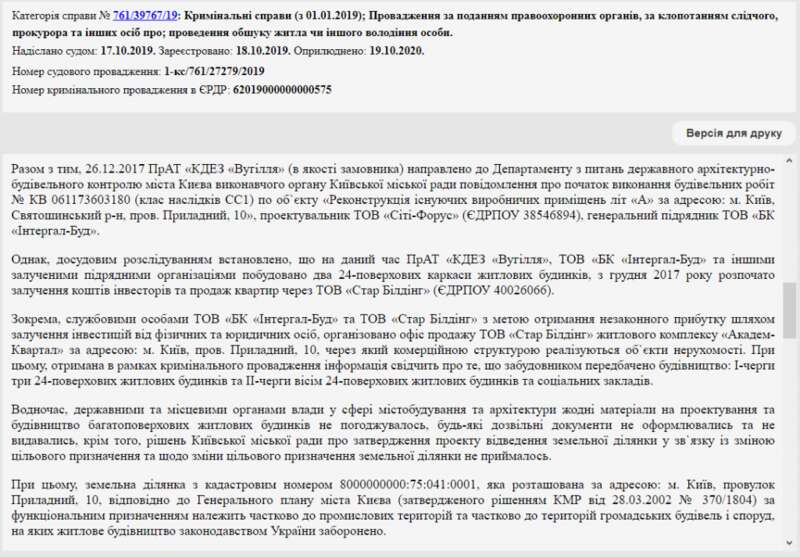 В обращении говорилось, что должностные лица Департамента градостроительства и архитектуры КГГА издали этот разрешительный документ, "злоупотребляя служебным положением, очевидно, с целью получения неправомерной выгоды от застройщиков". Потому что, по всей видимости, МУО были выданы на проектирование многофункционального комплекса с административно-бытовыми зданиями, но по факту на участке в пер. Приборном, 10, уже построены два 24-этажных дома.