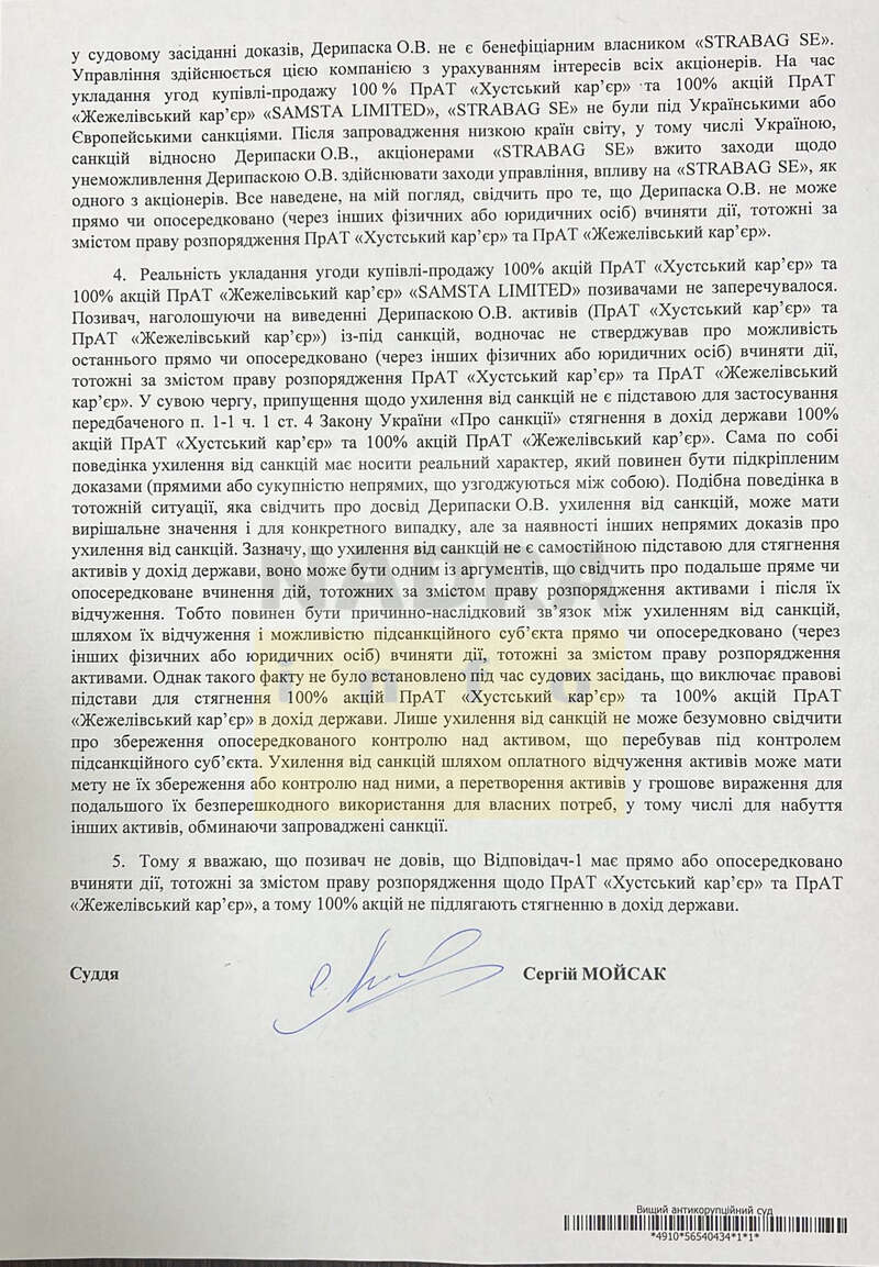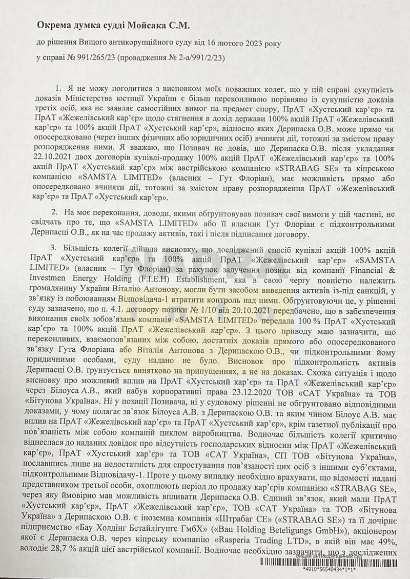 Судья Сергей Мойсак изложил Отдельное мнение , в котором выразил убеждение, что Министерство юстиции не доказало, что Олег Дерипаска имеет возможность «прямо или косвенно совершать действия, тождественные по содержанию праву распоряжения по ЧАО «Хустский карьер» и ЧАО «Жежеловский карьер» », а потому 100% акций не подлежат взысканию в доход государства».