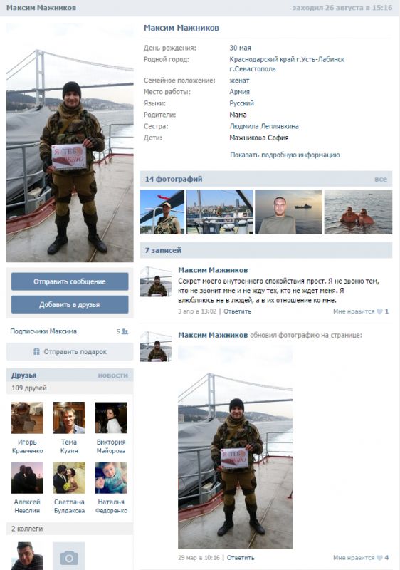 После Анатолия Голота мы стали искать профили других военнослужащих в/ч 13140 (810-ая Отдельная бригада морской пехоты) и натолкнулись на профиль контрактника этой бригады, Максима Мажникова: