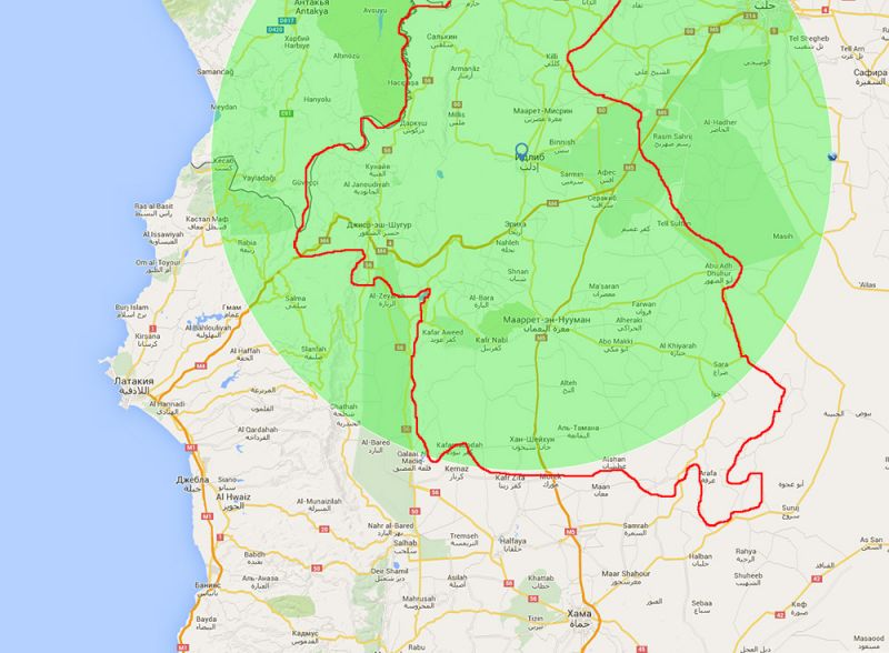 Но если мы передвинем центр окружности ближе к западной границе губернаторства Идлиб (о чём говорилось в сообщении ан-Нусра), например ближе к городу Йиср аш-Шугур, где идут столкновения между правительственными войсками, повстанцами и ан-Нусра, то в окружность идеально попадает авиабаза около Латакии: