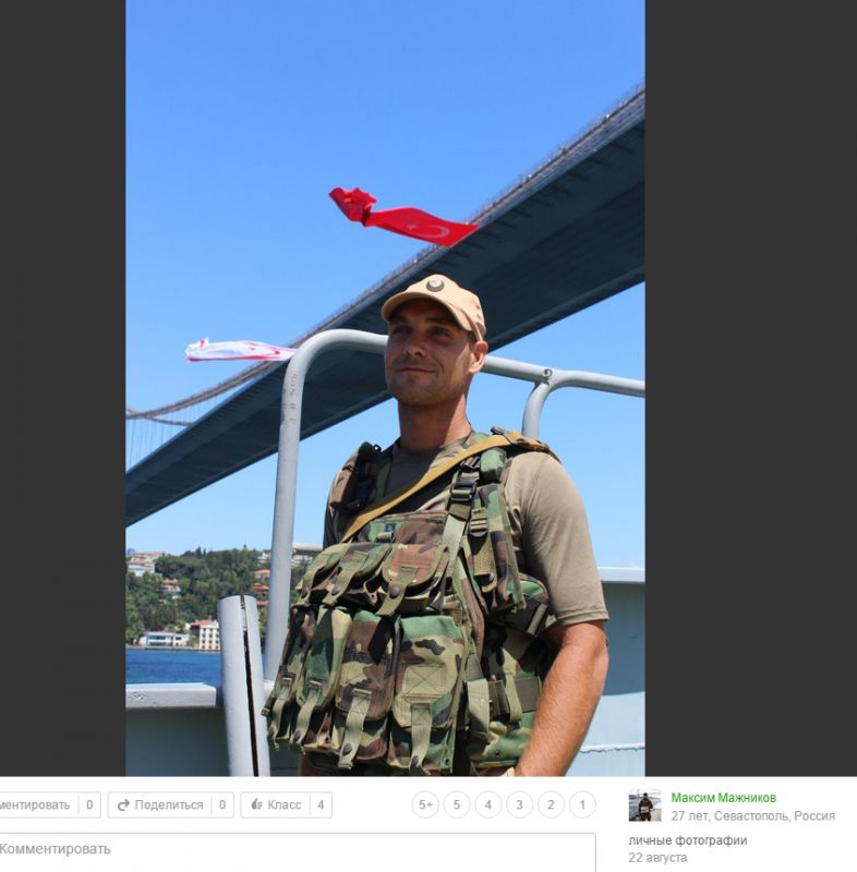 Внимание сразу же зацепилось за фотографию на его аватарке: он стоит в военной форме и с оружием в руках на палубе БДК, а на заднем фоне виден Босфорский мост. Эту фотографию он загрузил 29 марта 2015-го:
