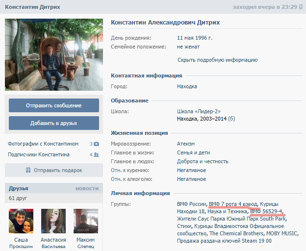 В профиле Константина указано, что он состоит в группе войсковой части 56529-4 (г. Владивосток):