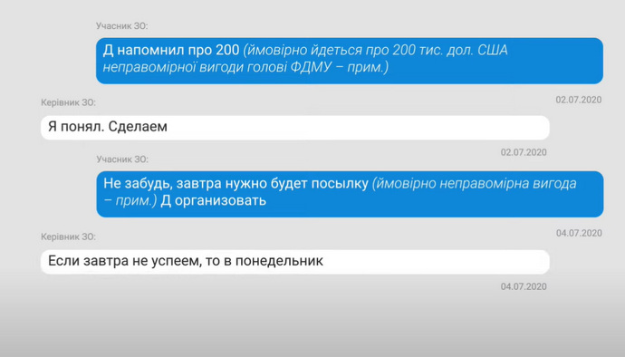 Участники группы, переписка которых опубликовало НАБУ, убеждают, что "платили Диме до последнего дня "фиксы" и что "Дими платили 200 тысяч долларов ежемесячно". Один из участников группы получал в десять раз меньше, но тоже ежемесячно.